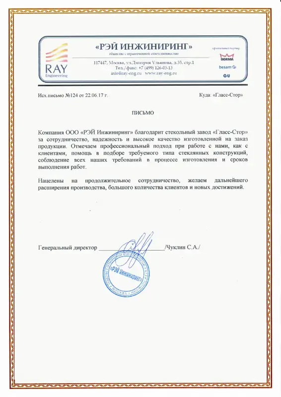 Компания ООО "РЭЙ Инжиниринг" благодарит стекольный завод DomGlass за сотрудничество надежность и высокое качество изготовленной на заказ продукции.