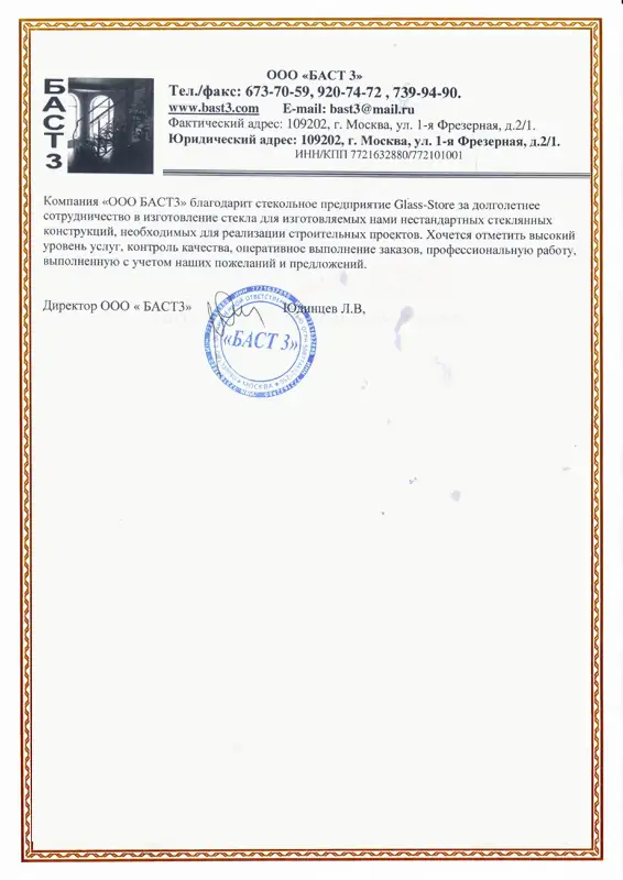 Компания ООО "БАСТ3" благодарит стекольное предприятие DomGlass за долголетнее сотрудничество в изготовление стекла для изготовляемых нами нестандартных стеклянных конструкций, необходимых для реализации строительных проектов.
