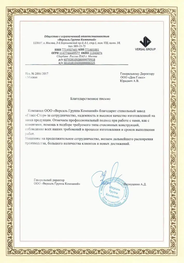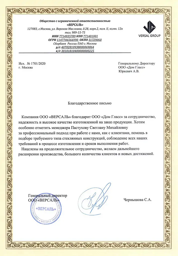 Компания ООО "ВЕРСАЛЬ" благодарит ООО "ДомГласс" за сотрудничество, надежность и высокое качество изготовленной на заказ продукции. Хотим особенно отметить менеджера Пастухову Светлану Михайловну за профессиональный подход при работе с нами, как с клиентами, помощь в подборе требуемого типа стеклянных конструкций, соблюдение всех наших требований в процессе изготовления и сроков выполнения работ.