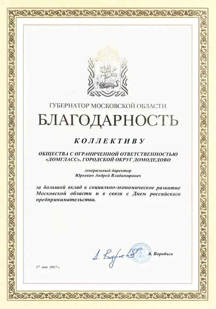 Благодарность от Губернатора Московской Области Коллективу ООО "ДомГласс" за большой вклад в социально-экономическое развитие Московской Области.