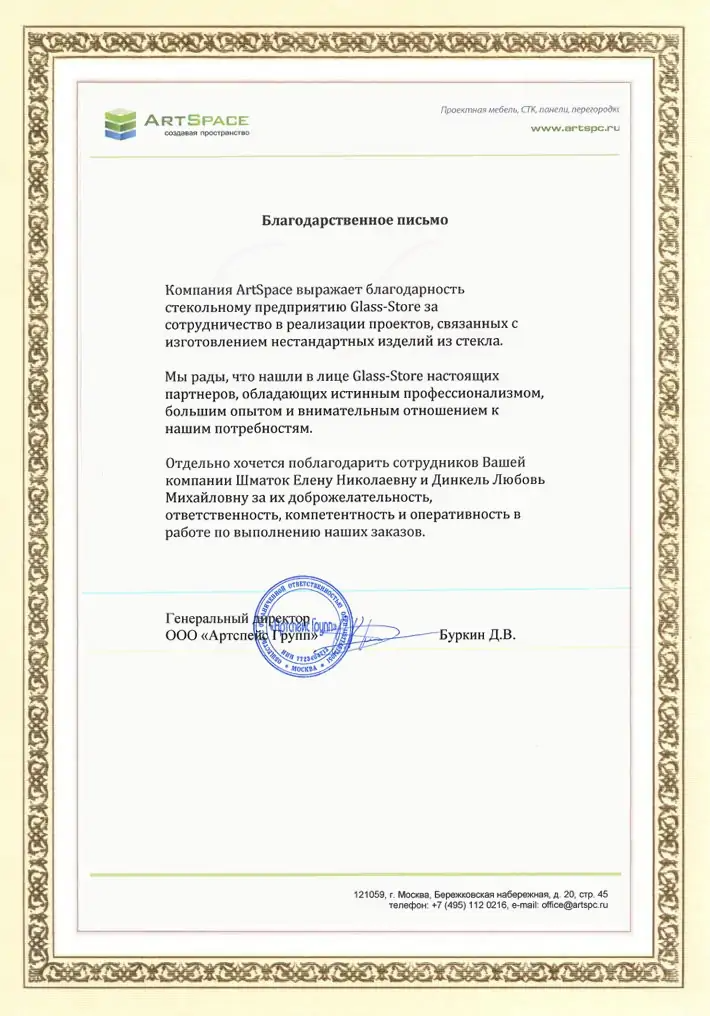 Благодарственное письмо ООО "Артспейс Групп"