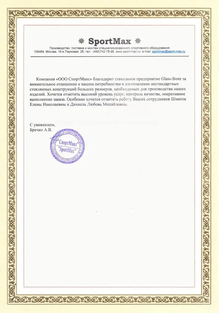 Компания ООО "СпортМакс" благодарит стекольное предприятие ДомГласс за внимательное отношение к нашим потребностям и изготовление нестандартных стеклянных конструкций больших размеров, необходимых для производства наших изделий. Хочется отметить высокий уровень услуг, контроль качества, оперативное выполнение заказа.