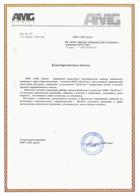 Благодарственное письмо ООО "АМГ Групп" 2018