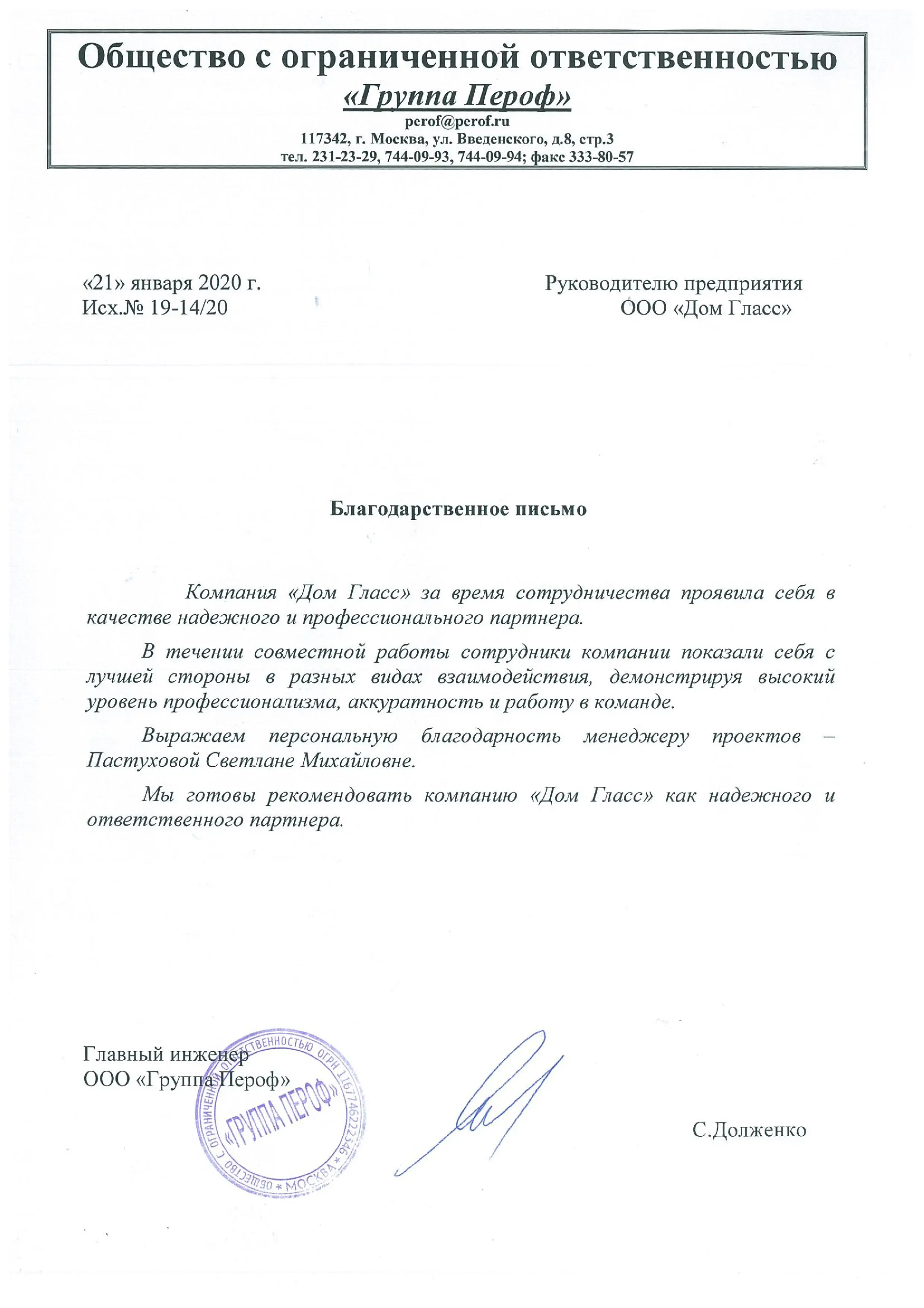 Благодарственное письмо ООО "Группа Пероф"